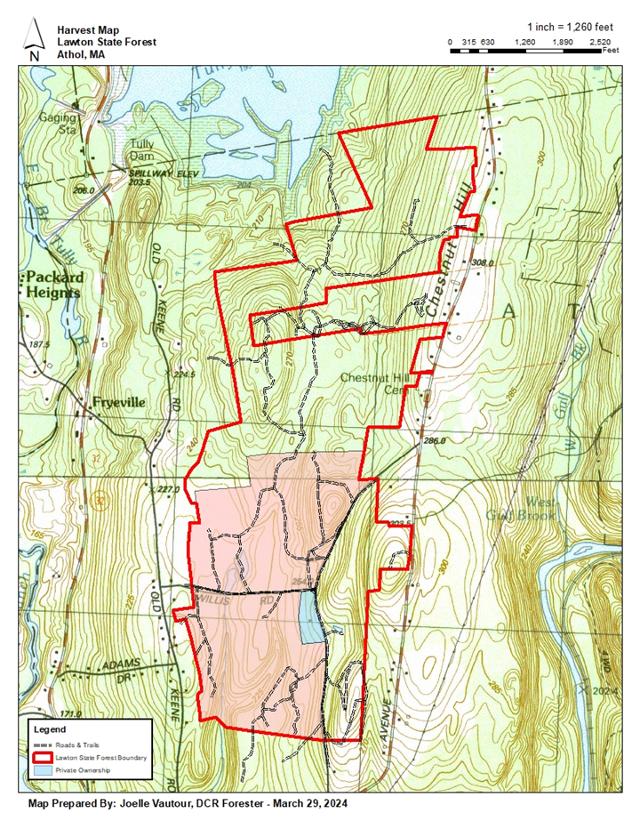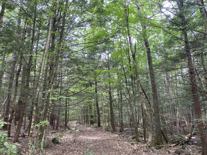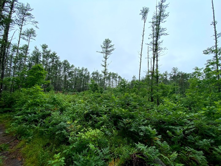 There are two major forest types located within the project area, totaling 231 acres. The first forest stand type contains 28 acres of mixed softwood plantations, including red pine, Scots pine, white pine, and Norway spruce. The remaining 203 acres are a white pine-hemlock-red oak forest type that naturally regenerated on abandoned agricultural lands. Both stands were managed extensively, with previous treatments applied to improve residual growing stock, as well as regeneration harvests in recent decades. All red pine and Scots pine stocking were harvested in 2022, with some of the Norway spruce and white pine plantations remaining in a stagnated condition. Portions of the naturally regenerated stands were last treated in the early 2000’s. Present regeneration is scattered, depending on light conditions.
